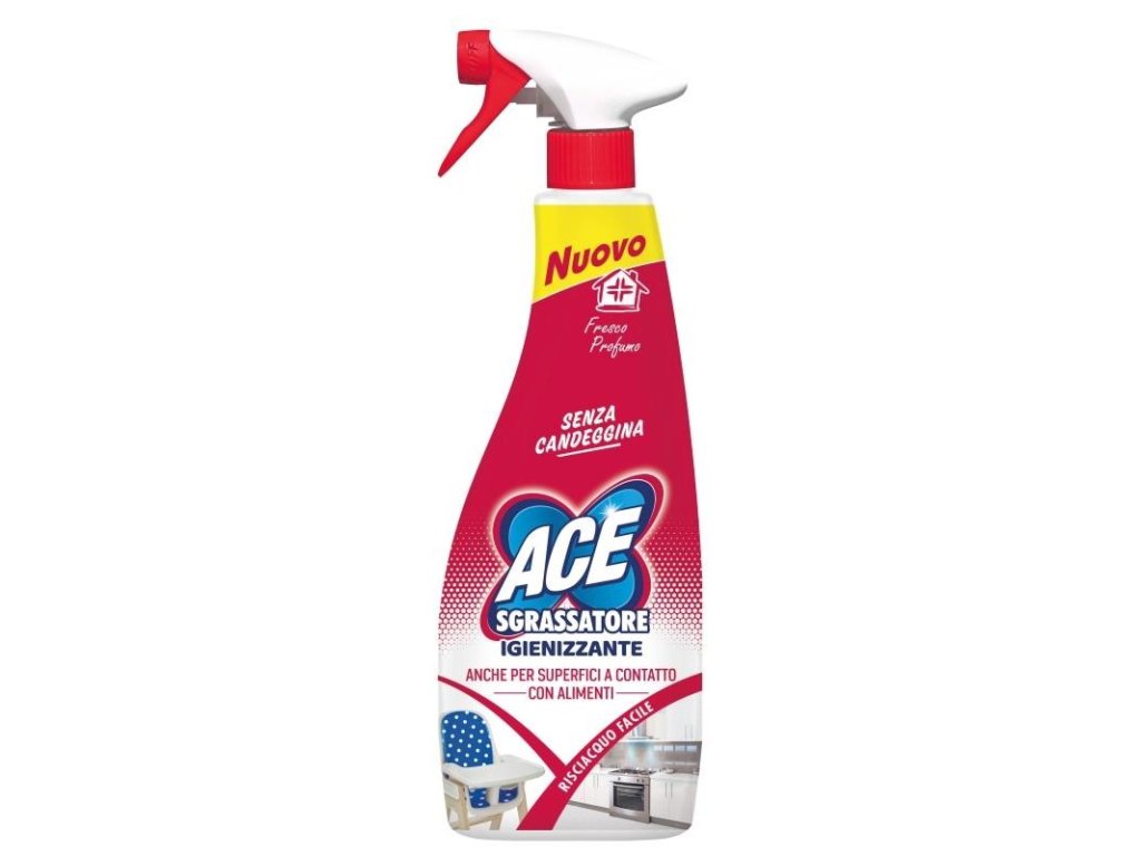 Vysoce účinný dezinfekční odmašťovač ACE Sgrassatore Igienizzante je ideální pro každodenní úklid domácnosti. Účinně odstraňuje mastnotu, nečistoty a zároveň hygienicky čistí povrchy – bez použití chlóru (bez bělidla).