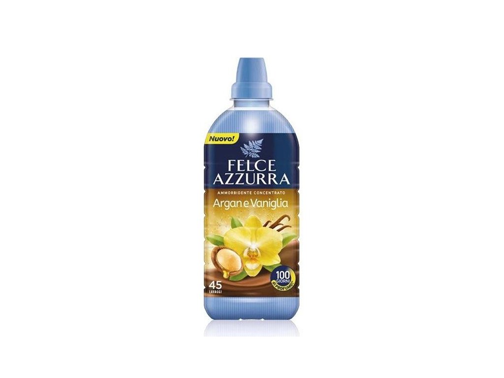 oncentrovaná aviváž s esenciálními oleji Felce Azzurra Argan e Vaniglia s vanilkou a arganovým olejem zanechá vaše prádlo extra měkké a provoněné intenzivní orientální vůní. Ideální v kombinaci pracích prostředků značky Felce Azzurra k zintenzivnění vůně, které naleznete v nabídce našeho eshopu. Nové složení daruje prádlu extra svěžest až po 100 dnů (v případě uložení prádla v šatníku). Koncentrované složení na 45 pracích dávek. Dovoz Itálie.